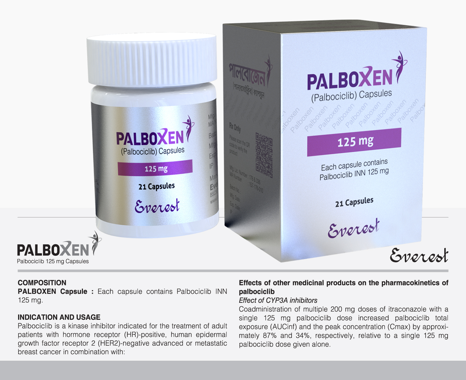 INDICATION AND USAGE Palbociclib is a kinase inhibitor indicated for the treatment of adult patients with hormone receptor (HR)-positive, human epidermal growth factor receptor 2 (HER2)-negative advanced or metastatic breast cancer in combination with: ⚫an aromatase inhibitor as initial endocrine-based therapy in postmenopausal women or in men; or ⚫ fulvestrant in patients with disease progression following endocrine therapy. PHARMACOLOGY Palbociclib is a highly selective, reversible inhibitor of cyclin-dependent kinases (CDK) 4 and 6. Cyclin D1 and CDK4/6 are downstream of multiple signalling pathways which lead to cellular proliferation. DOSAGE AND ADMINISTRATION The recommended dose of PALBOXEN is a 125 mg capsule taken orally once daily for 21 consecutive days followed by 7 days off treatment to comprise a complete cycle of 28 days. PALBOXEN should be taken with food. Administer the recommended dose of an aromatase inhibitor when given with PALBOXEN. Please refer to the Full Prescribing Information for the aromatase inhibitor being used..